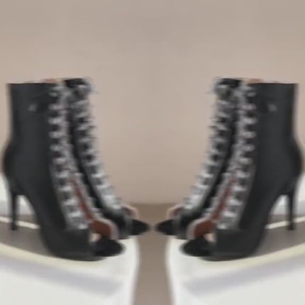 Tåbrakettform: Fiskemunn Farge: Svart Overmateriale i sko: PU Bruksmåte: glidelås bak Sålemateriale: gummi Størrelse: 35, 36, 37, 38, 39, 40, 41, 42, 43